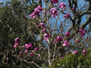 First flowers blown open on the New Zealand form of Magnolia ‘Lanarth’.