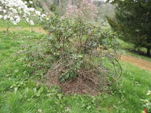 Need to explain to the gardening team to remove brambles swamping young shrubs and to remove saplings growing up amid plants.