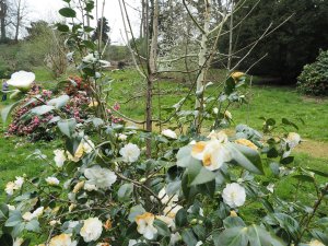 Trewithen’s fine display vase of Camellia x williamsii ‘E G Waterhouse’, Camellia japonica ‘Matterhorn’ and Camellia japonica ‘Lady Loch’.