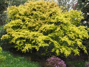 Acer palmatum ‘Summer Gold’ and Rhododendron canadense – one dwarfs the other.