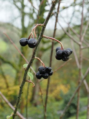Mespilus germanica with just a few ripe and well split medlars remaining on the tree. A few did not develop properly and have turned black.