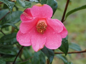 First flowers on the paler of the two original Camellia saluenensis by the ladies loo. The darker form is only a day or two away as well.