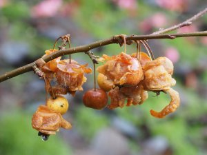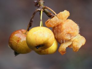 As you will remember I am allergic to the smell of rotting quinces. Many of these fruits have now fallen onto the ground and, at first sight, nothing else seems to like eating them either. Badgers, squirrels and even pheasants seem to have left most of them alone. Just a couple show pheasants have pecked them or perhaps the gaggle of guinea fowl which roam about in Kennel Close.