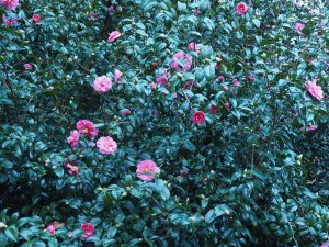 Tail end flowers now on the huge Camellia sasanqua ‘Hugh Evans’ clump.