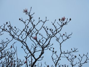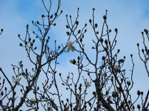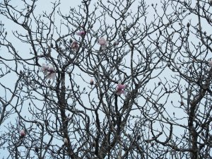 Several flowers on several of the Magnolia grandifloras. Not unusual in recent mild winters but unbelievable to previous generations.