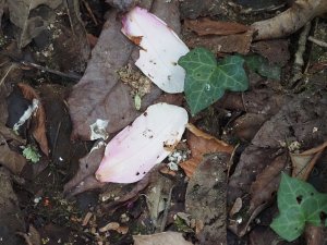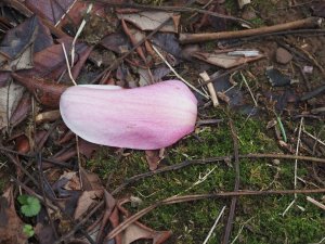 Rooks, crows and jackdaw droppings cover the fallen magnolia leaves under a large magnolia. A good flock have been roosting here out of the recently prevailing east wind.