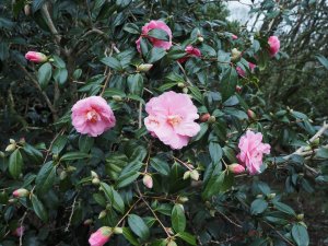 No frost yet, some gunnera have green leaves. C sasanqua moderate, a fair lot of roses, lapageria, and coums. Erica hardly open, geraniums fair, wall flowers starting.