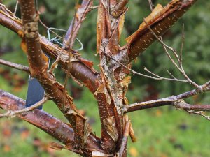The solution is, I think, if time permits, to literally cut off the remaining leaves in say late October. It will not harm the plant but might prevent this!Snapped off at around 18in from the base due to the weight of its leaves and seven years’ worth of growth wasted. It will probably reshoot; perhaps even from above the graft, but will then be a horrible multi stemmed shape and never make a decent tree.