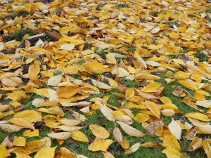 The largest Gingko biloba shed all its leaves overnight so no autumn show this year due to the frost. A large pile of yellowish leaves.