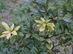A few pale secondary flowers on Rhododendron augustinii which is quite a surprise for December.