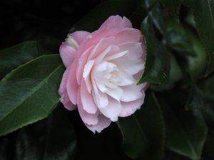 Camellia ‘Faith’ with rather variable shaped flowers; some more semi-double than others. A 40 year old plant and one of the first camellia groups that I planted beside and below Donkey Shoe. One for Asia to add to the nursery cuttings list.