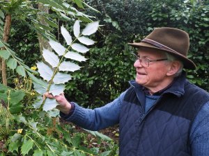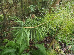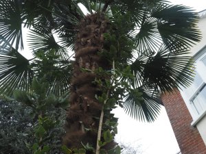 Mahonia hartwegii climbing (or being trained) up a Trachycarpus fortunei. Nearly 25 feet tall.