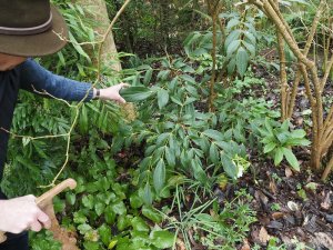 Jaimie and his team dug and moved the Rhododendron falconeri layers yesterday. These layers from the old original clump which flowers in May were made at least five years ago and have developed nicely into individual plants and little clumps with good root balls. With enough light they have grown up towards the light but, after moving, still need stakes to keep them upright and to prevent the root balls being moved in the wind before they root out more fully.Digging with great care to avoid breaking the root balls. The plants were moved only to the other side of the path into a specially cleared new site in dappled shade.
