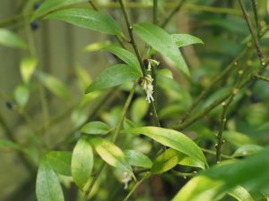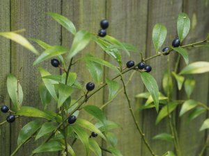 Sarcococca bleddynii with flower and fruits.