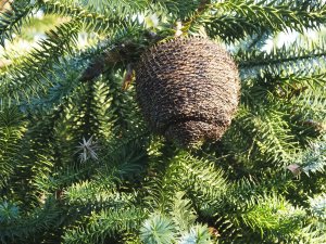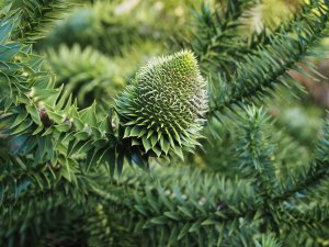 Araucaria angustifolia with a ripe 2 year old cone ready to drop soon and a new young cone (one of several) starting out on its journey.