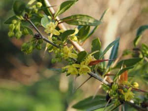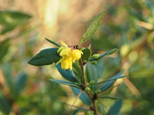 Lindera angustifolia with fine autumn colour in the sun. Lower down the leaves are still green. Semi-evergreen in Cornwall (as we have seen before) and one of the most vigorous and quick growing trees. Nice bark too.