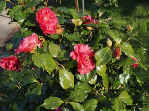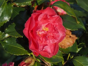 Camellia ‘Holly Bright’ can be red or white. Leaves identical on both our plants but the reference books say semi-double light (bright) red.