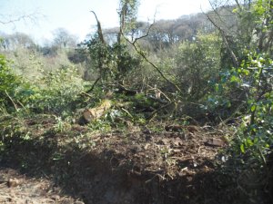 Frankie digs out the layered stumps on the lower side of the laurel hedge below the Main Ride.