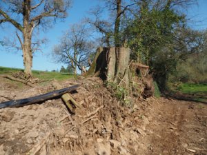 Nearly completed clearance of the two huge trees at the entrance to Withy Moor and stumps up-righted in the hedge.