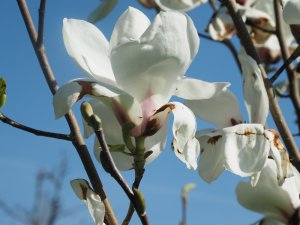Magnolia ‘Caerhays Surprise’ and a blue sky.