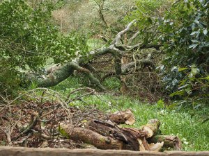 A fallen old sycamore with a rotten base which must come down unnoticed in recent storms by Bramble Field gate. It has done little damage in a laurel hedge.