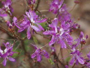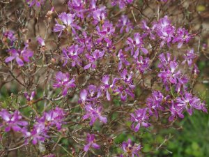 Rhododendron canadense – a true dwarf from Canada – a group of 3 outside the front gate.