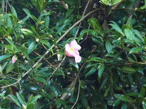 First flower nearly out on Camellia ‘Mary Costa’ near Georges Hut.