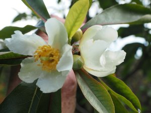x Gordolinia grandiflora with its first flowers ever here in the Styrax area. It is about 10 feet tall. The flowers are said to be slightly scented but the emphasis is on the slight! A cross between Gordonia and Franklinia bred in N. Carolina. When I think about it I have seen flowers here on another plant but not this one and not in the autumn.