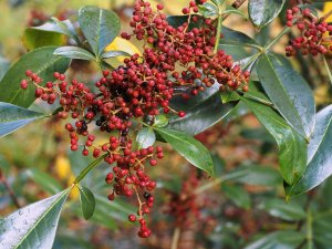 The evergreen Zanthoxylum armatum (NJM 11.080) is expelling its black seeds from their reddish pods exactly as the other species do. The multi-stemmed bush has fallen over from the weight of its multi-spined branches.