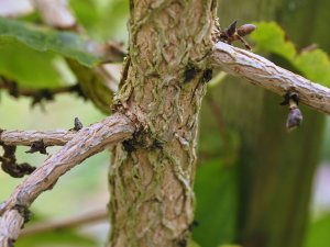 Rhus chinensis (if that is what it is) with interesting bark and unwelcome squirrel damage.