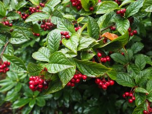 Taxus baccata ‘Standishii’ – a female form of fastigiate holly which has yellowish new growth. Here with its first crop of berries that I have seen anyway. Planted 2008.