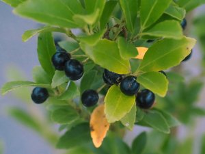 This is a self or bird sown Ilex kingiana which has flopped over or been pushed over into the light by a nearby common holly. Some berries even on this young plant.