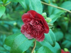 A bud on the old Camellia sasanqua ‘Rosea’ on the castle wall.