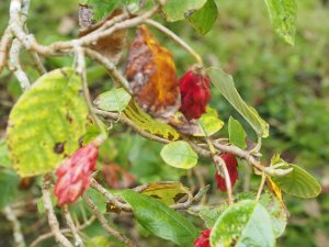 Cornus kousa ‘Doubloon’ was covered in fruits. Since I spotted them first the pheasant poults have taken at least half of them. I have never seen the fruit on this tree before.