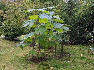In the early spring we dug out some old camellia stumps. Where we cut into the roots of a nearby Paulownia root suckers have appeared everywhere.