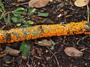 This orange fungus seems only to grow on fallen magnolia branches under large mature leaves.