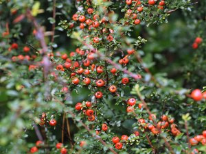 Fruits and berries in the frames beside the greenhouses.Crataegus dahurica will be new in the 2022 Burncoose catalogue. Conventional hawthorn berries.
