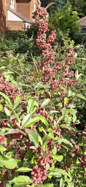 The top grafted Crateagus grignoniensis has been photographed before in this diary but seldom fruiting as well as this! The pheasants are, as yet, uninterested.