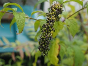 Secondary flowers on Viburnum rhytidophyllum which I had not expected after such a heavy crop of flowers in the summer.