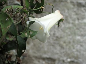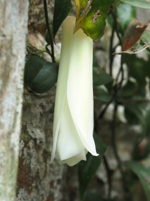 First flowering here I believe of the replacement white Lapageria given to us by Tom Hudson outside the Smoking Room.
