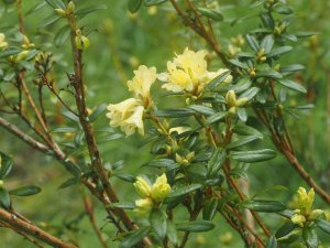 The clump of Rhododendron ‘Yellow Hammer’ is now making a good show.