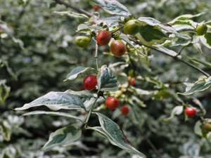 Ripe fruits flowering on Cornus mas ‘Variegata’.