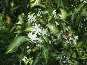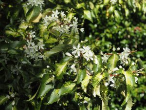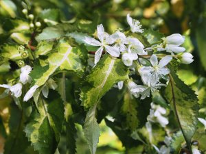 Hoheria populnea ‘Variegata’ is the best thing in the garden today. Flowering better than I have ever seen it. Yellow-green leaves edged darker green.