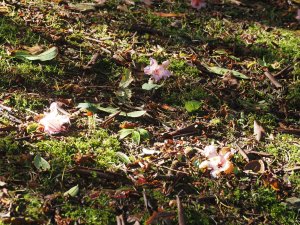 The last fallen flowers under Rhododendron ‘Harrow Hybrids’.