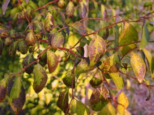 Photinia villosa var. laevis covered in berries but far less ripe.