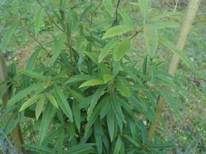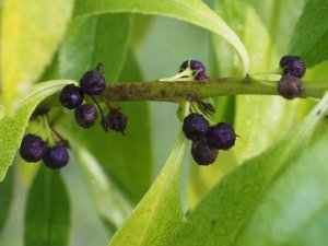 Microtropis petelotii is a little known shrub from Vietnam which is supposed to have violet fruits in late summer. I suppose they may yet turn. The leaf looks correct when you search this online but many of the pictures are nothing to do with this plant and obvious rubbish so I am not yet 100% certain of the identity of this oddity from Crug Farm. The fruit looks like a Euonymus species? Then I discover that Burncoose stock this variety so we must have grown this from seed. The Burncoose plants look a little different in their leaf form. This plant need full shade which it hasn’t got here but it survived the drought in good order.